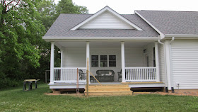 There were a few details that we did not finish before winter hit. One was steps leading to the yard on the main porch. Dave made some steps in an empty room in the house, then the neighbor and I carried them outside to the front of the porch. They were heavy!